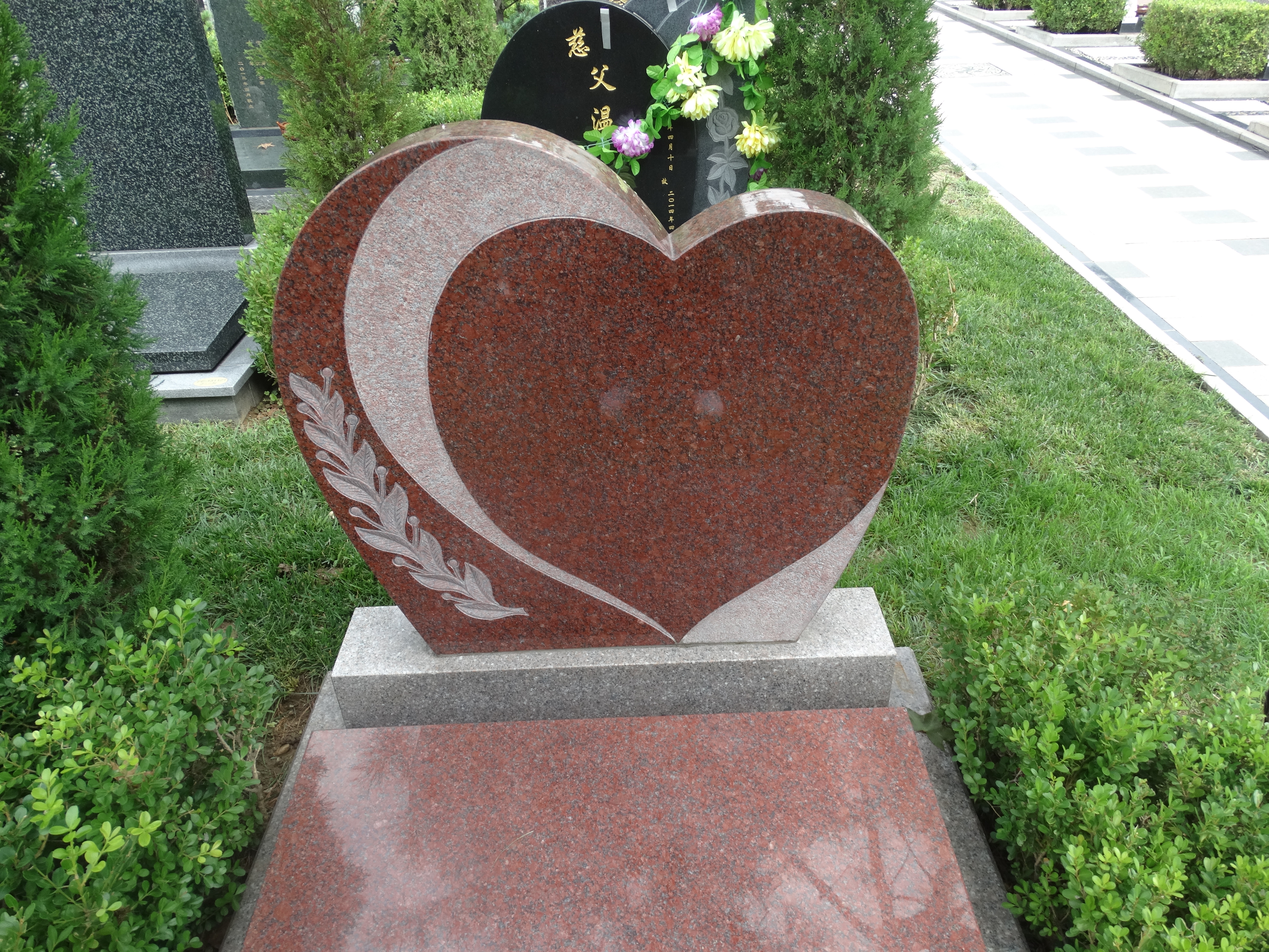 上圖中的墓碑選用了印度紅石材,造型為一個愛心,石材顏色和造型的搭配相得益彰,寓意逝者是一個有愛心的人,也表達出對逝者緬懷哀思的心意。是逝者品性高潔的象征。將雕刻和石材造型等元素組合而成,獨具藝術氣息和個性符號。